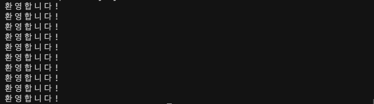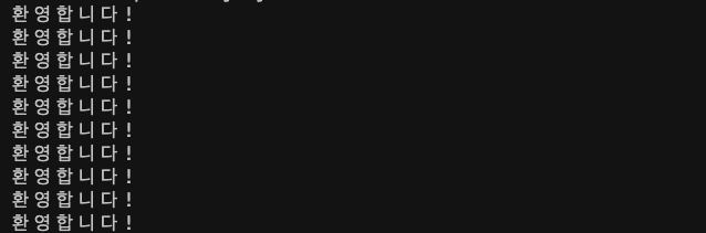 결과는 "환영합니다! "의 출력이 멈추지 않고 계속해서 출력된다.